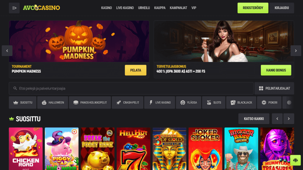 AvoCasino tarjoaa parhaat kasinopelit, uusimmat pelijulkaisut, ajankohtaiseen vuodenaikaan liittyvät pelit jne. Valikoima kattaa kolikkopelit, crash-pelit, jackpot-pelit ja livepelit. Pelejä löytyy joka lähtöön ja pelivalmistajia on mukana runsaasti. Niistä löytyvät mm. BGaming, Betsoft, Evolution, NetEnt, Play’n GO, Endorphina, Quickspin jne. Pelivalmistajia pääsee selaamaan kasinolla erikseen.