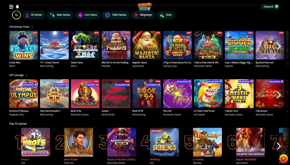 Rabbit Reelin peliaula pitää sisällään erilaisia listoja, kuten Top 10 pelit, uudet pelit, Gathering of the Gods, Book of -pelit jne. Tarjonta on selvästi koottu siten, että kaikille löytyy varmasti mieluisaa tekemistä.