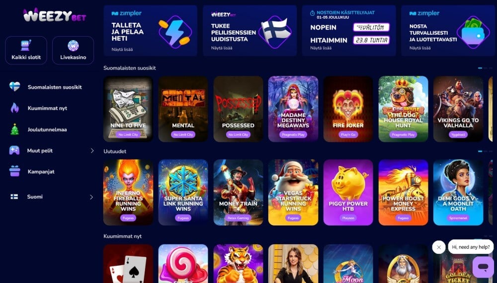 Weezybet on lokakuussa 2025 avattu pikakasino. Tämä violetti nettikasino pitää sisällään valikoiman parhaita kasinopelejä. Kasinoa hallinnoiva Geeker Technology N.V. operoi Curacaon pelilisenssin (OGL/2024/251/0130) alla, joten voitot eivät ole verovapaita. Weezybet toimii Curacaon peliviranomaisten valvonnan alla.